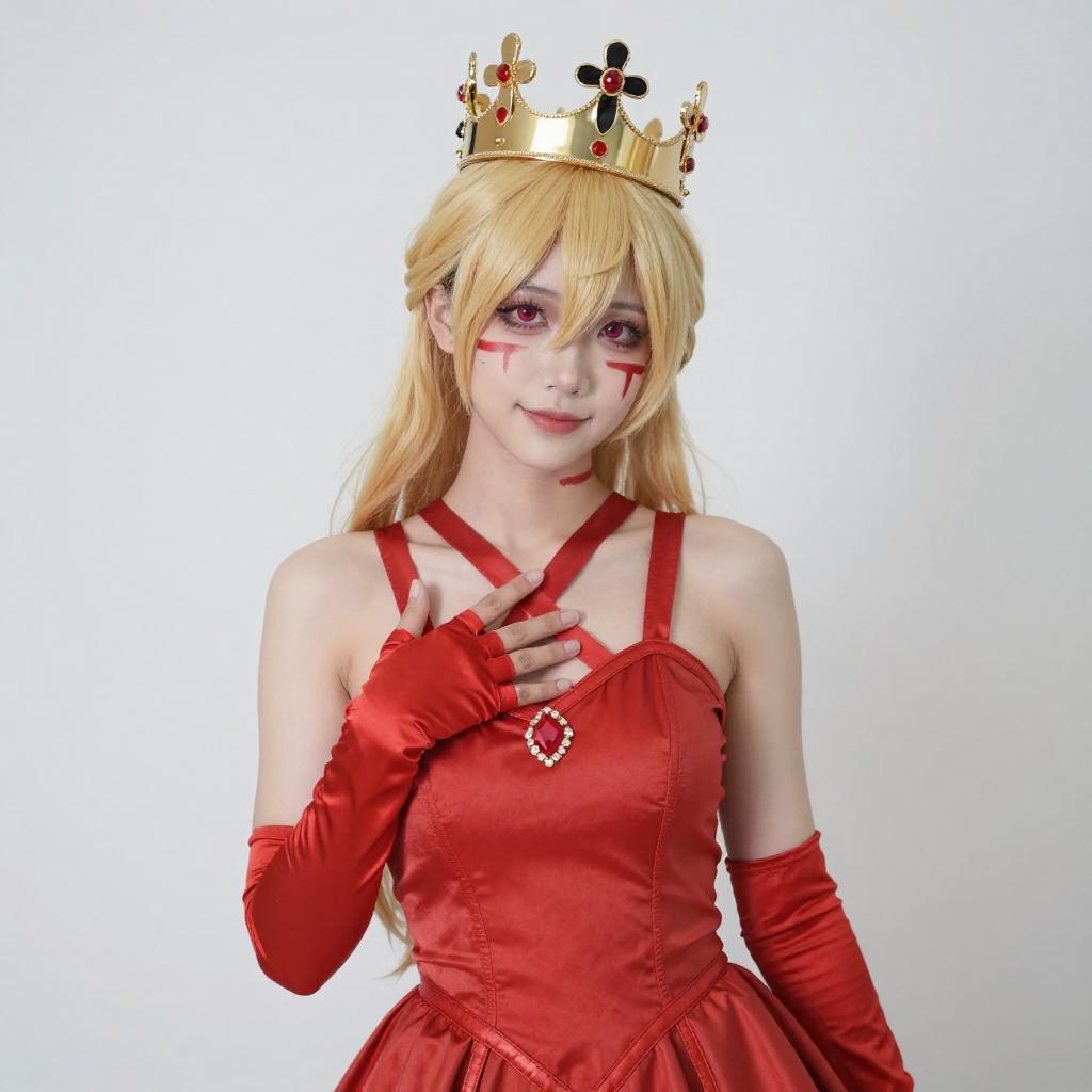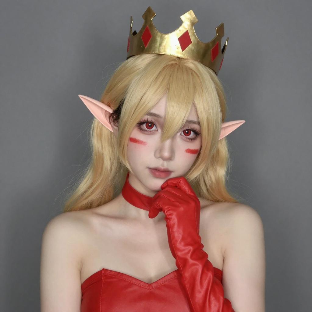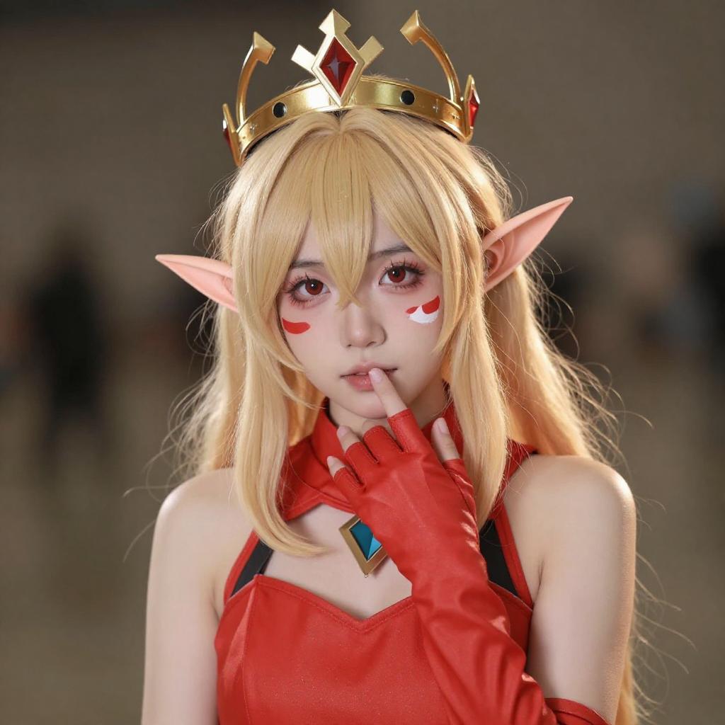 Photograph of a blonde cosplayer with elf-like ears, wearing a golden crown adorned with red and black flowers. She has pale skin, red makeup, and is dressed in a red, crisscrossed dress with long red gloves. She is posing with one hand near her face, smiling slightly. The background is a simple, brightly lit room with wooden flooring.