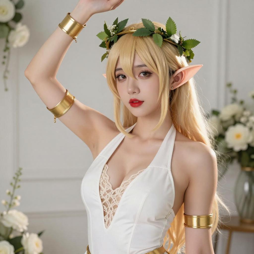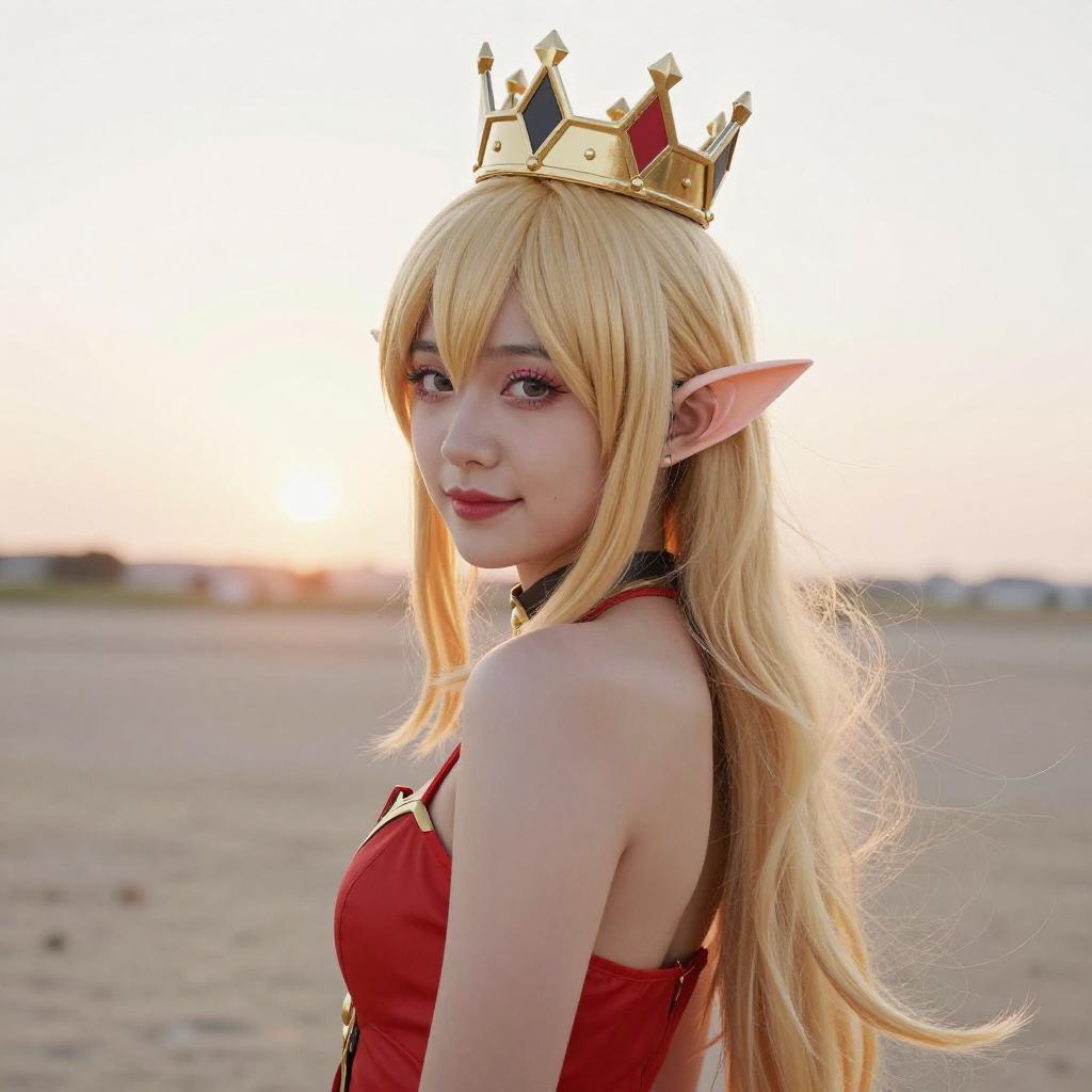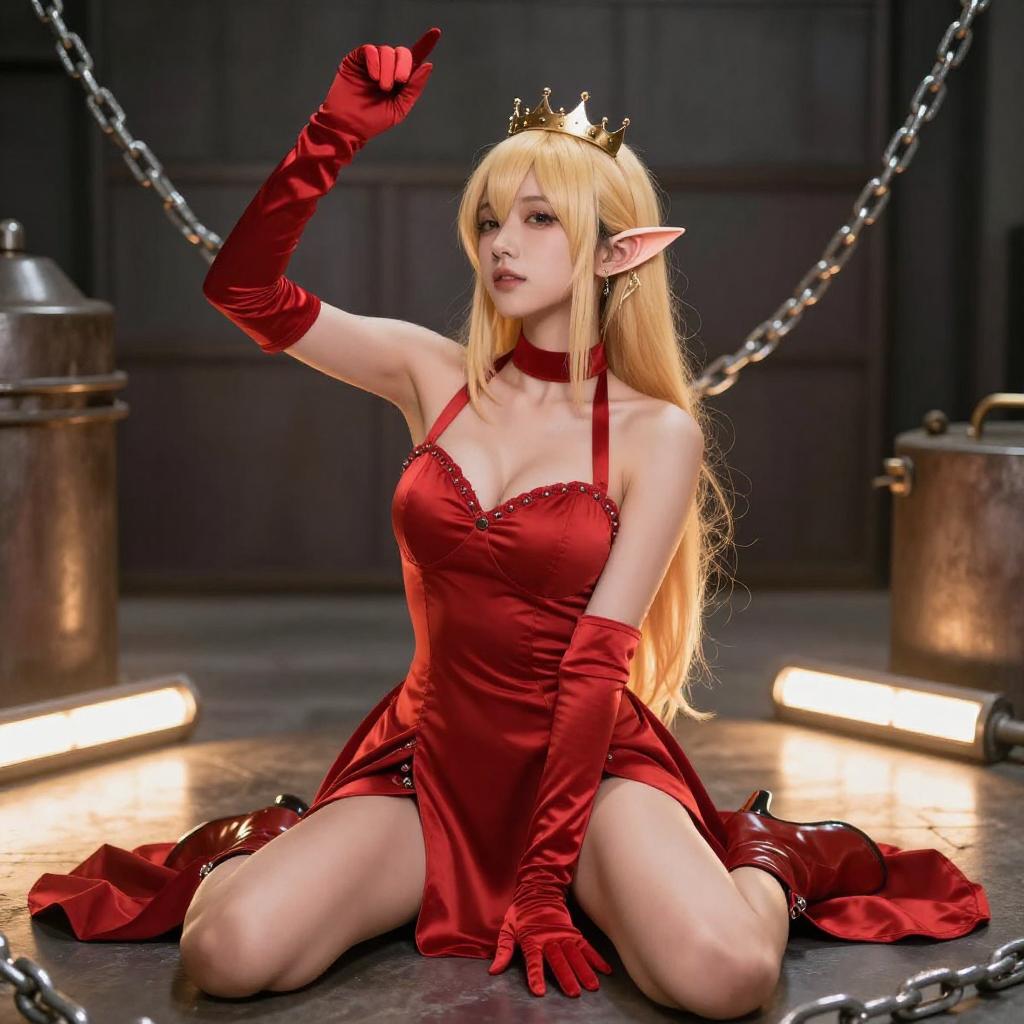 Blonde Elf Cosplayer in Red Dress