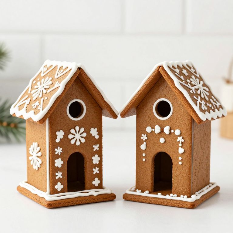 Two intricately decorated faux gingerbread birdhouses, featuring brown bodies, white icing details, and festive floral patterns, stand side by side on a clean white surface, ready to add charm to holiday decor.