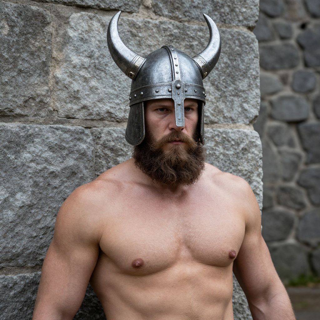 Photograph of a muscular, bearded man with a silver Viking helmet, standing against a stone wall, shirtless, showcasing his defined chest and arms