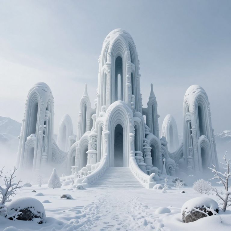 In a realm where silence echoes with forgotten tongues, alien architects sculpted frozen soundwaves into towering structures, their hollow arches whispering secrets of eternity amidst the serene, snow-kissed stillness.