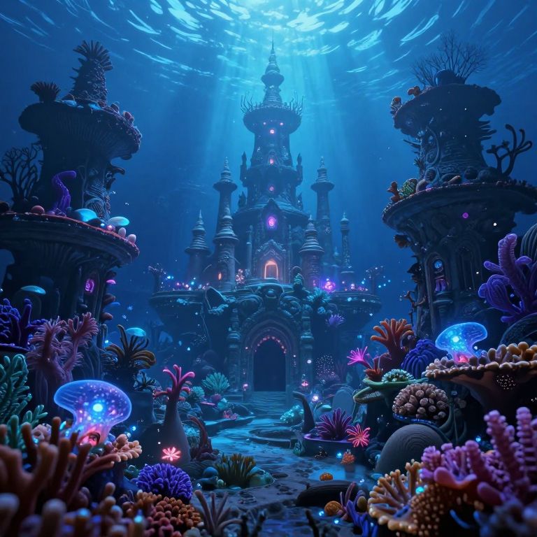 Digital artwork of a glowing underwater castle surrounded by vibrant, bioluminescent coral and jellyfish, illuminated by blue light rays from above.