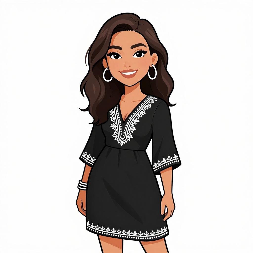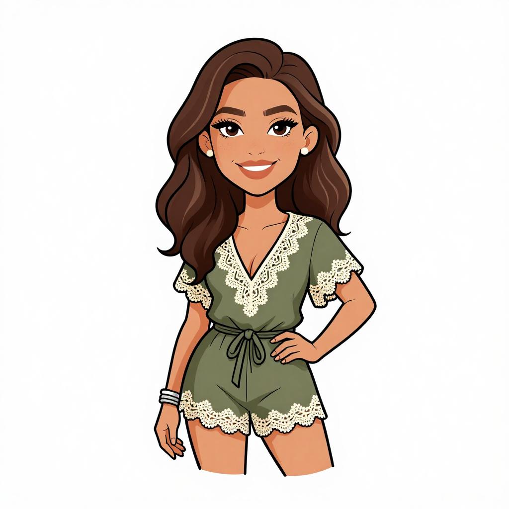 Woman with pretty face and pretty hair. smiling Woman, bohemian, olive green romper with white lace detailing, V-neckline, short loose sleeves, lace bordered hem on shorts, cinched waist, silver bangle on wrist. --sref 1467