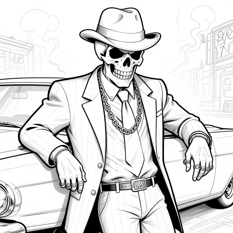 Gangster skull coloring pages depicting a menacing skull dressed in a pinstripe suit and tie, adorned with chains and rings, leaning against a vintage car, with stylized smoke and street art surroundings, designed for detailed black and white coloring.