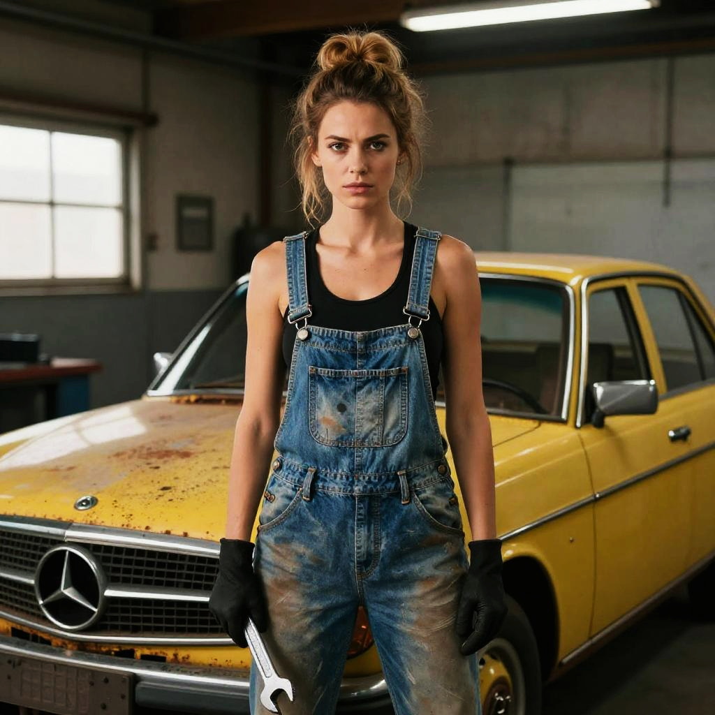 Realistic photo.a female mechanic, in a post-apocalyptic garage, inspired by Mad Max, with an athletic build, wearing rugged overalls realistic photo