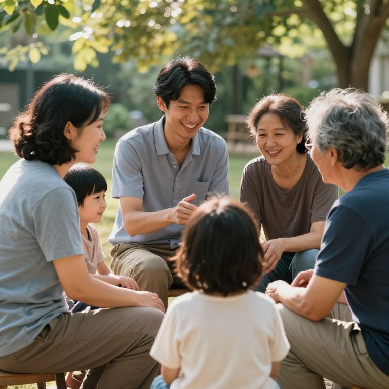 Photograph of a joyful East Asian family of five sitting outdoors, laughing and interacting, sunlight filtering through tree leaves.