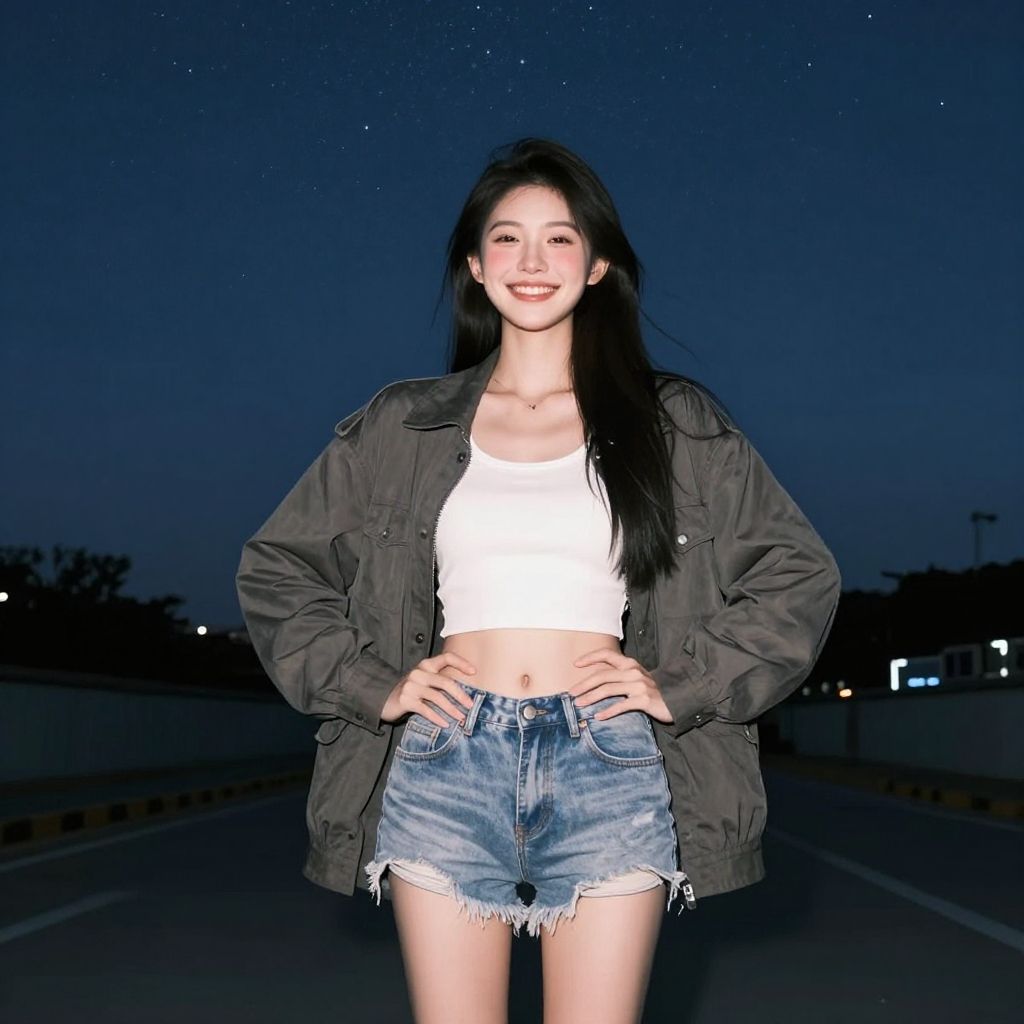 Photograph of an Asian woman with long black hair in a ponytail, smiling confidently at the camera. She wears a blue denim jacket over a white crop top, and high-waisted, frayed denim shorts. She stands outdoors at night with a dark, starry sky in the background. Her hands rest on her hips, and she has a bright, even skin tone. The lighting highlights her face and upper body, casting shadows behind her. A faintly visible street and power lines are in the background.