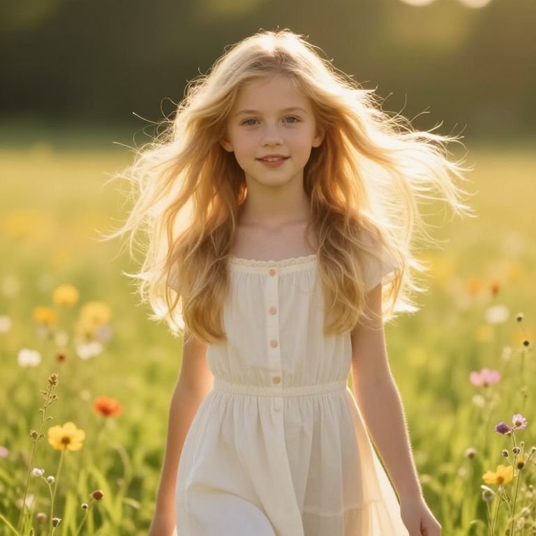 Young woman with blonde hair standing in a sunlit meadow, soft breeze flowing through her hair, wearing a white summer dress, vibrant green grass and wildflowers surrounding her, warm golden hour lighting, serene and peaceful atmosphere, photorealistic style