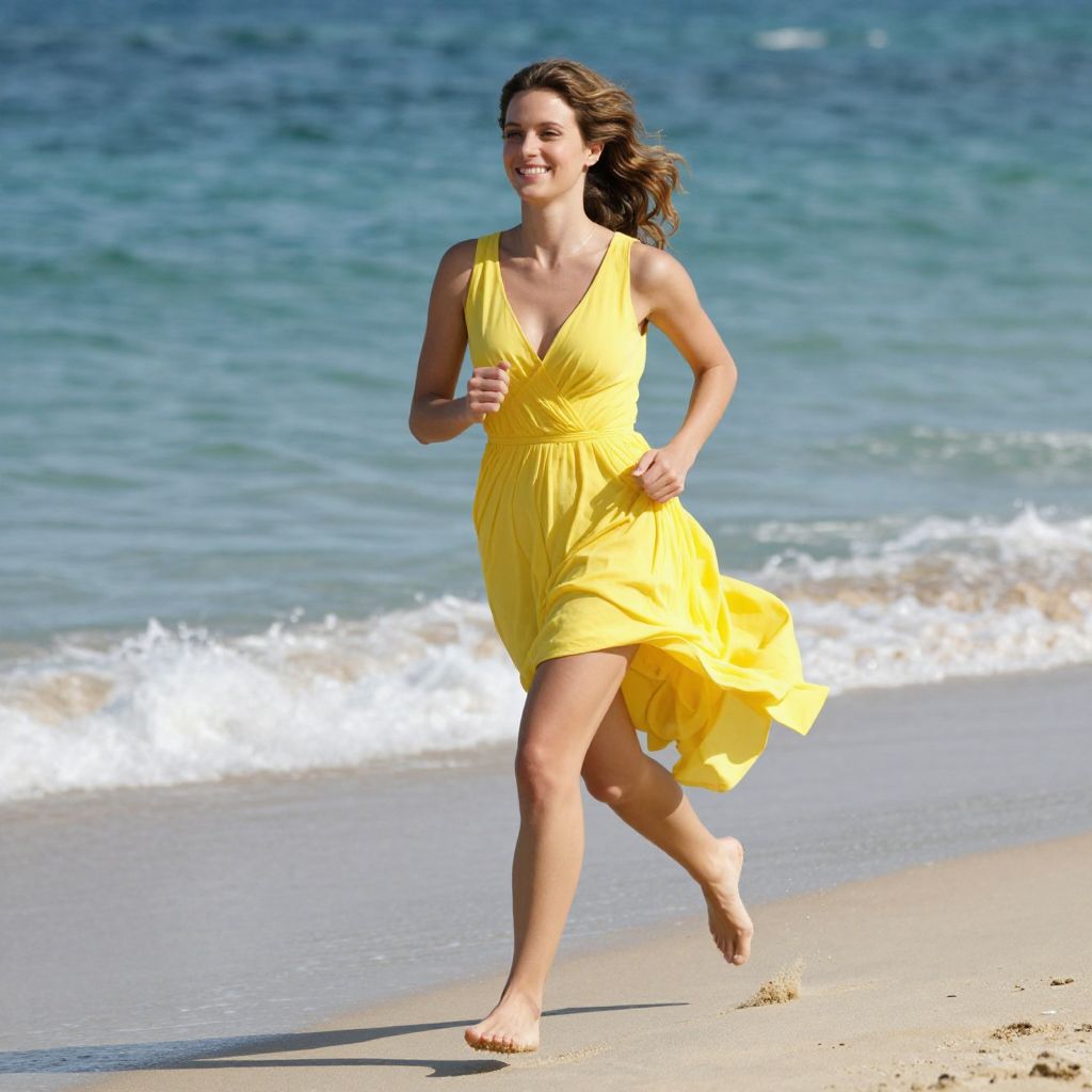 A photograph of a smiling woman with wavy brown hair, running barefoot along a sunny beach. She's wearing a bright yellow, V-neck dress that flows freely as she runs. The dress contrasts with the blue and green hues of the ocean waves gently washing onto the shore. The sand is light beige, and the sunlight highlights her joyful expression and the texture of her dress.