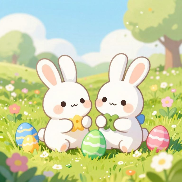 A vibrant digital illustration featuring two adorable Easter bunnies nestled among colorful eggs and blooming flowers, set against a serene, sunlit meadow with a soft, cartoonish style that evokes a cheerful and whimsical atmosphere perfect for laptop backgrounds.