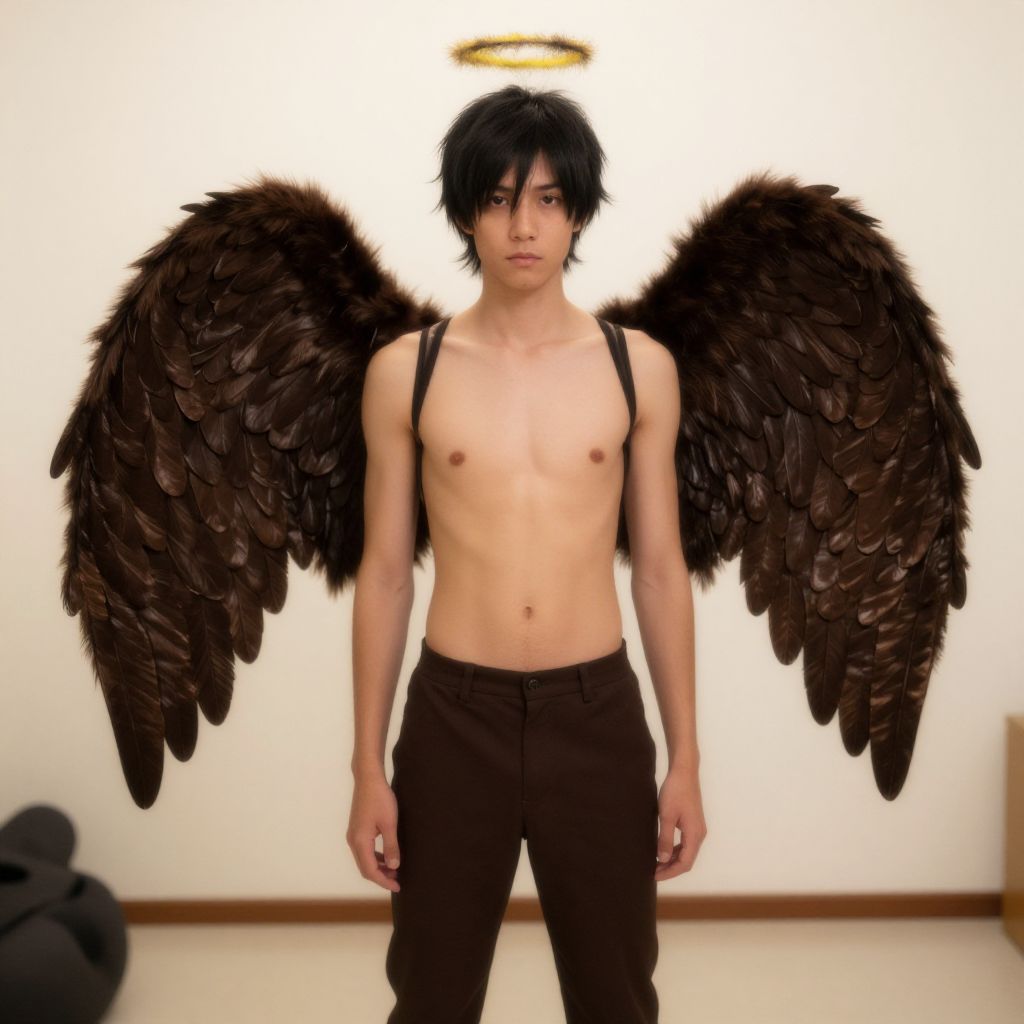 "costume black wings, solo, wings, 1boy, male focus, black wings, full body, black hair, black footwear, pants, standing, black pants, hood, looking at viewer, feathered wings, long sleeves, arms at sides Realistic photo of casual sexy person with pretty face"