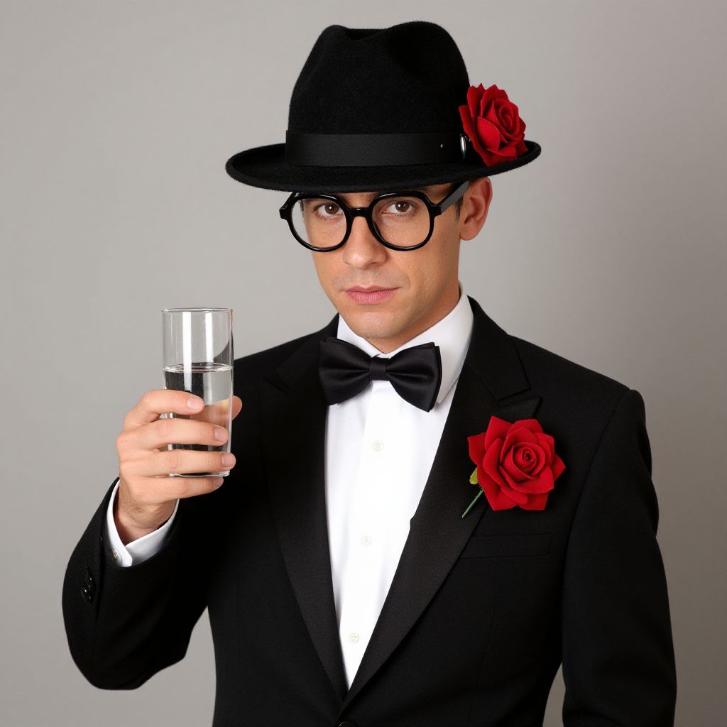 Photograph of a young man with light skin and glasses, wearing a black bowler hat adorned with a red rose, a black tuxedo with a white dress shirt and black bow tie, and a red rose boutonniere. He holds a clear glass of whiskey in his right hand, raised to his chest. The background is a plain, light gray. His expression is neutral, and the image has a slightly vintage, stylized feel. The contrast between the black formal attire and red flowers adds a touch of elegance and sophistication.