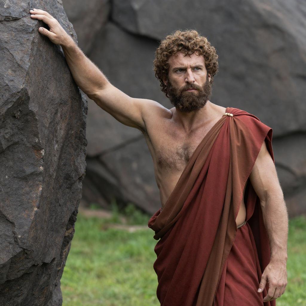Photograph of a muscular, bearded man with curly brown hair, wearing a red and brown toga, standing beside a large, dark rock. Background includes a rocky wall and green grass. Man's right hand grips the rock, intense expression on his face. Daylight illuminates his face and upper body. One person.