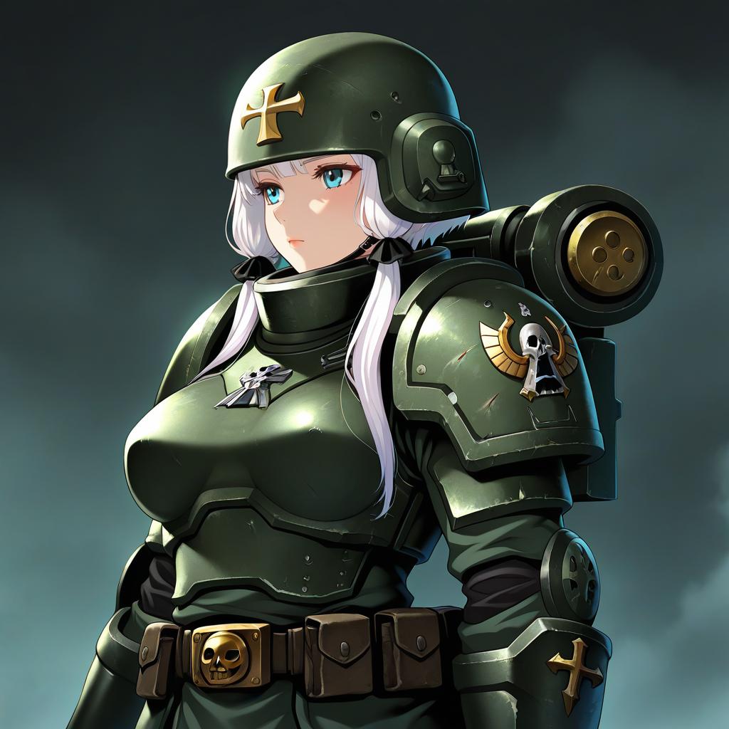 Astra militarum, warhammer 40k, 1girl, short hair, medium breasts, military uniform, armor, helmet, military uniform, by artist hikage eiji, illustrious
