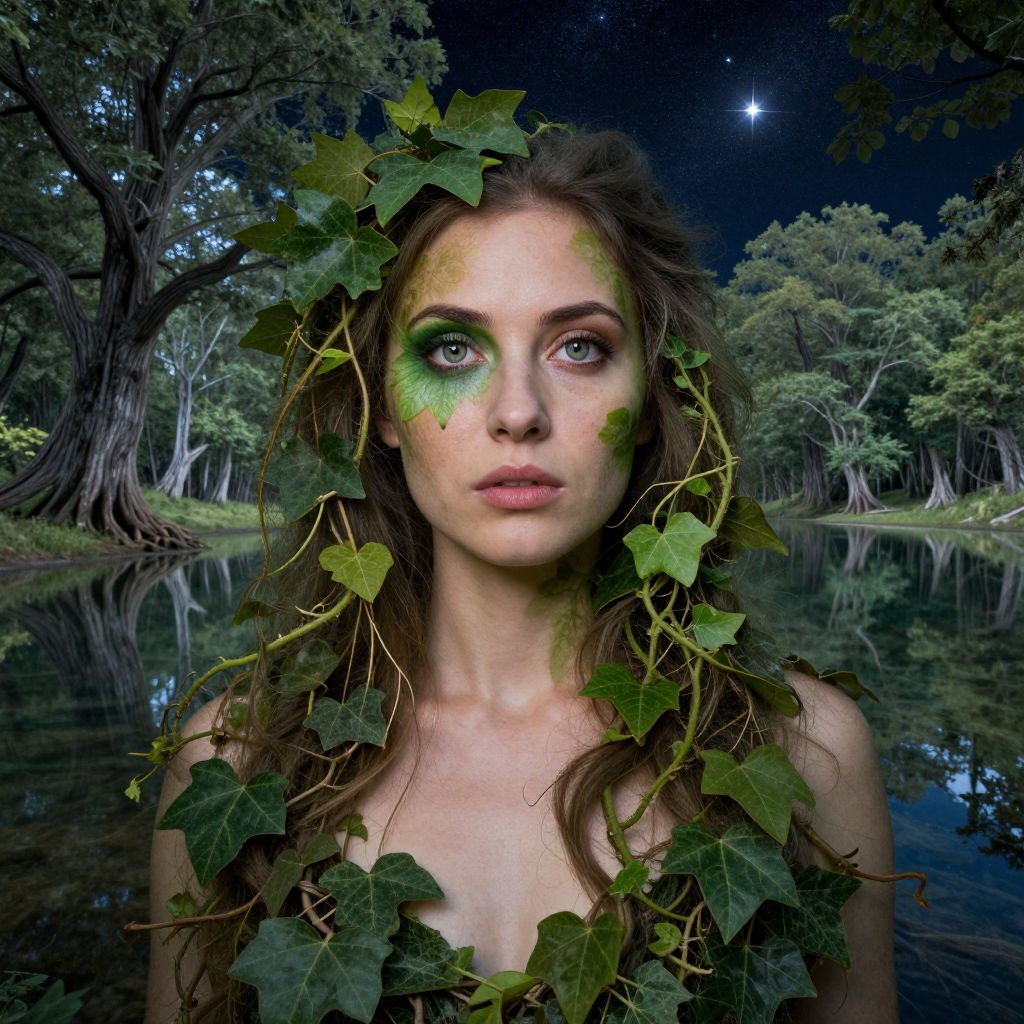 Photograph-style digital art of a fair-skinned woman with green leaf makeup, surrounded by ivy, standing in a moonlit forest by a reflective