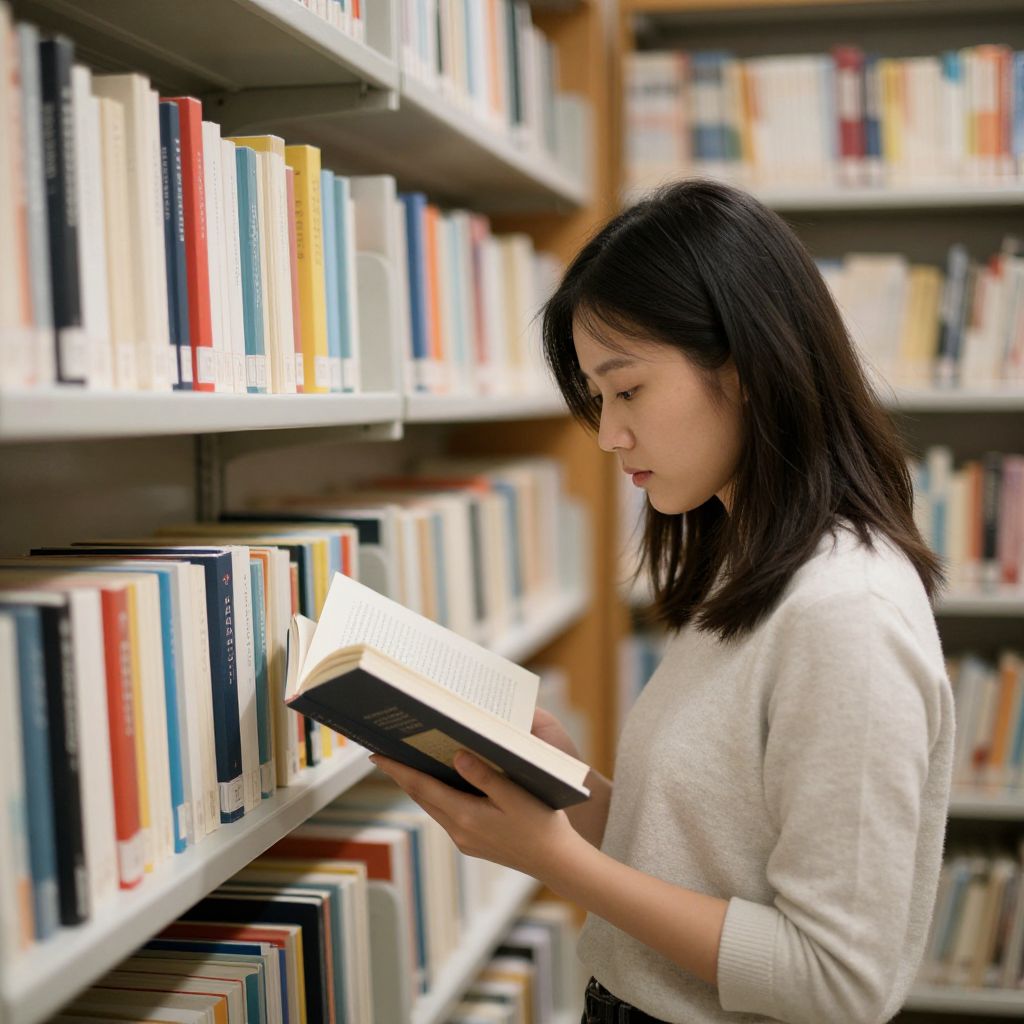 Asian woman with black hair, wearing white sweater, reading book in library; shelves filled with colorful books in background.