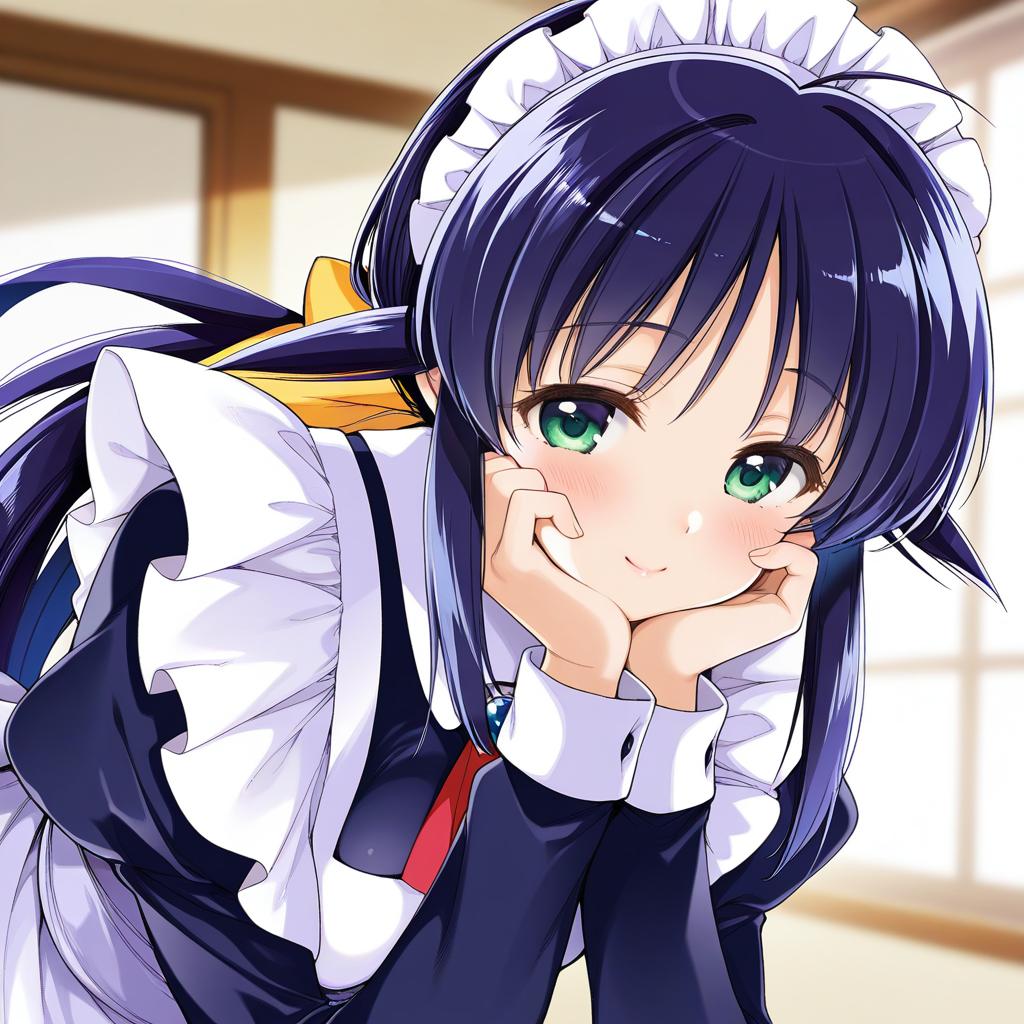 Andou mahoro, mahoromatic, 1girl, maid, maid, maid headdress, green eyes, long hair, blue hair, by artist sakiyo cake, illustrious