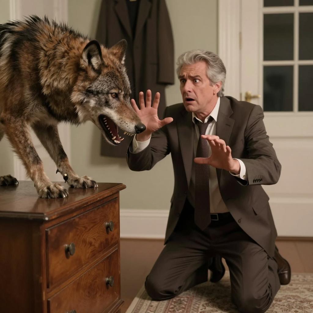 A large, fierce werewolf with open mouth and bared teeth leaps toward a standing, gray-furred werewolf. A man in green crouches, arms raised, next to a frightened woman in a red dress. Urban alleyway background. Two people. Intense expressions.