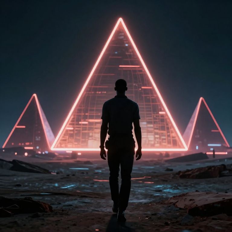 A futuristic, sci-fi scene featuring a black male figure walking towards illuminated neon pyramids in a desolate, otherworldly landscape.
