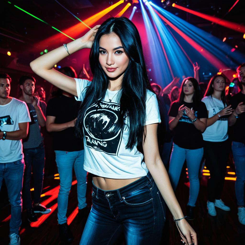 Realistic photo.a 19 year old girl, long black hair, graphic tee and skinny jeans, dancing in a nightclub, flashing strobe lighting and coloured spot lights, highly detailed, 8k, sharp, professional, clear, high contrast, high saturated, vivid deep blacks, crystal clear