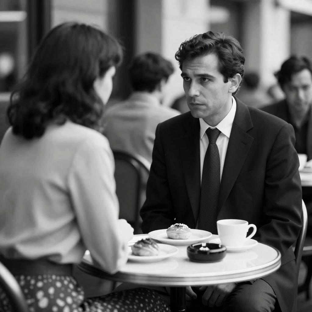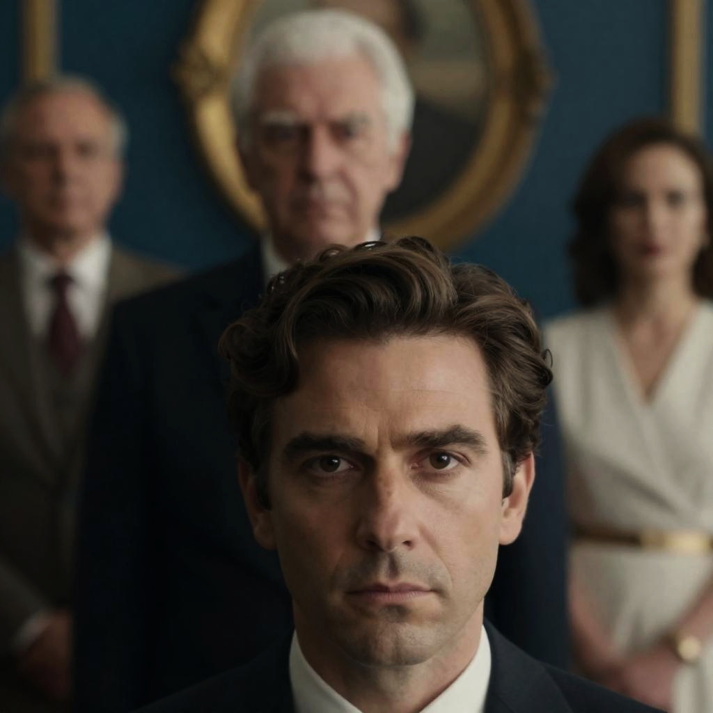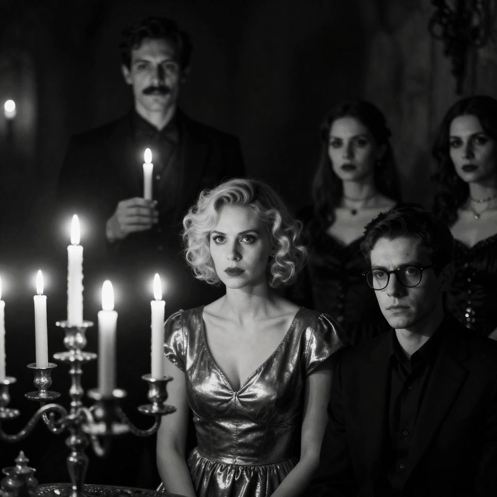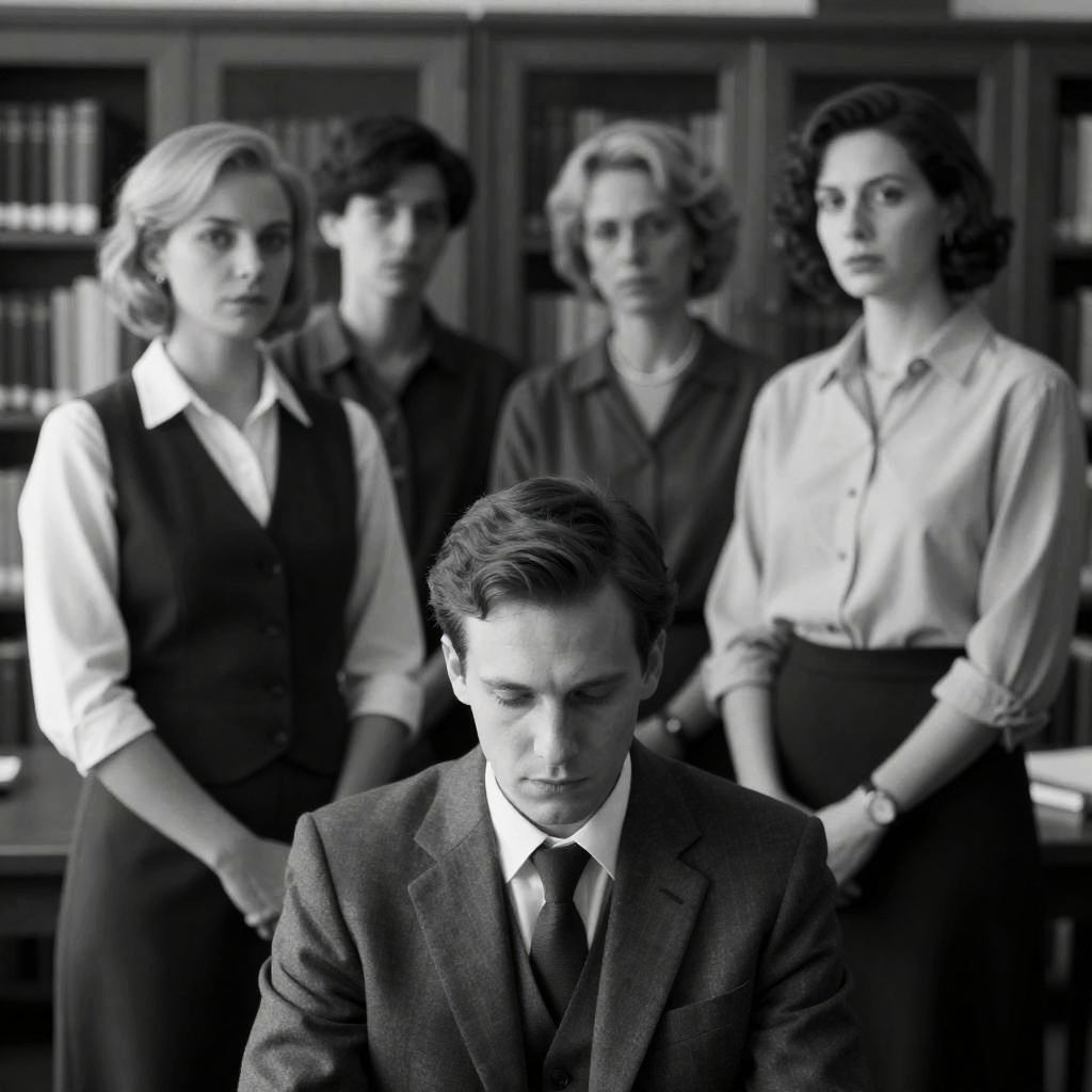 Black-and-white photograph of four people in a library. Man in suit sits in foreground, three women stand behind. One woman with short blonde hair wears vest over blouse, others wear dresses and blouses. Bookshelves and glass cabinets in background. Women gaze at man, man looks downward. Intense expressions on women's faces.