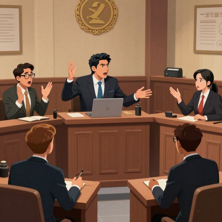Digital illustration of a courtroom scene featuring five male lawyers in dark suits, white shirts, and ties. The central figure, with short black hair, is speaking animatedly, raising his hands, and has a laptop on the wooden judge's bench. To his left, a bespectacled lawyer with dark hair gestures with his hands, while to his right, another lawyer with black hair and a red tie raises his hands. Two other lawyers, seen from behind, sit at the front with notebooks and pens. The background includes a beige wall with a gold "2" emblem, framed documents, and a small black speaker.