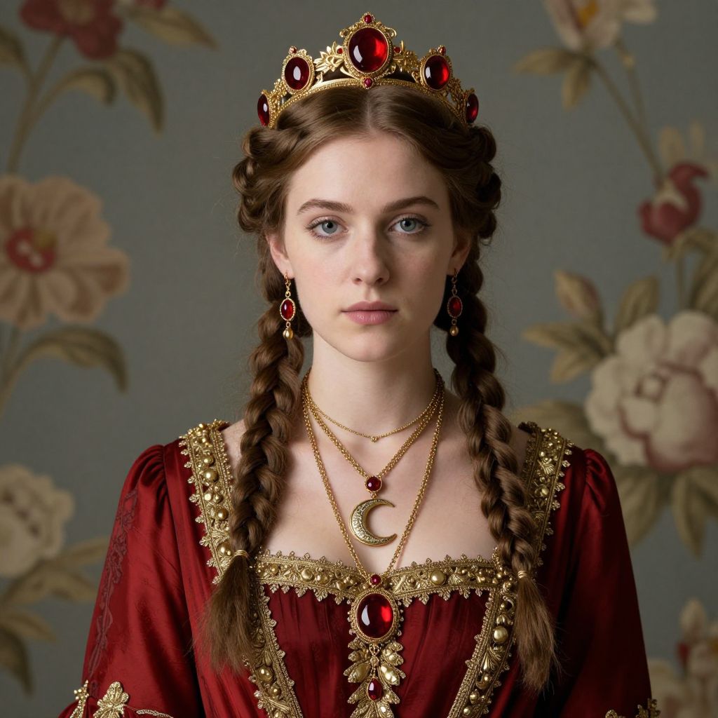 Elegant portrait of a Victorian-era woman adorned with intricate jewelry, including a golden tiara with three red gemstones, braided hair cascading down her shoulders, layered necklaces featuring a crescent moon pendant and a large red gemstone, and a richly detailed red gown with gold embellishments against a floral-patterned backdrop.
