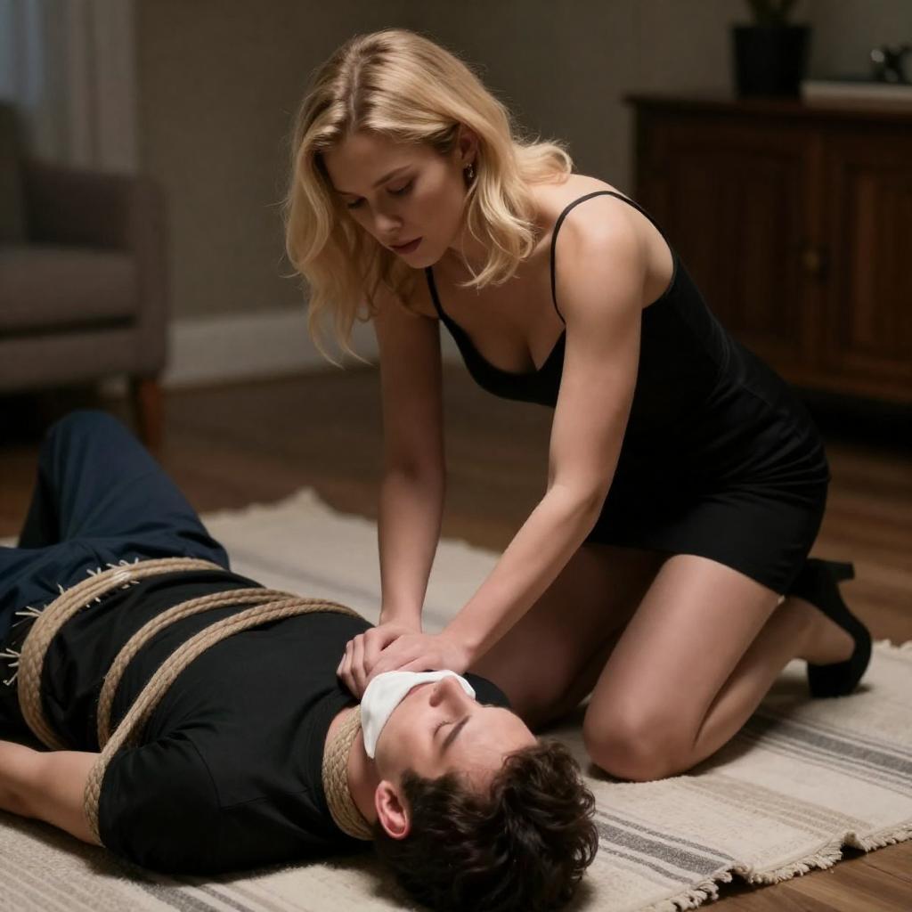 A photograph of a dimly lit, industrial-style room. A blonde woman with short hair, wearing a black strapless top and blue shorts, is bound to a wooden chair with ropes. A man in a gray suit and bow tie stands beside her, holding a syringe to her neck. The background includes dark, ured walls and hanging ropes. The image has a dark, gritty aesthetic.