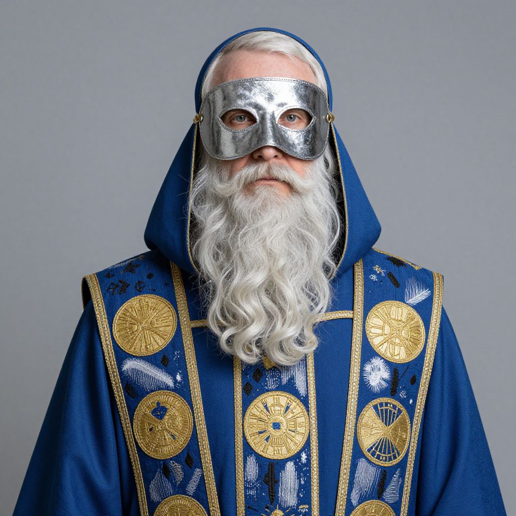 Graduated Nd Filter a blue robed cleric with a silver mask depicting an elderly man with a flowing beard, golden sygils on the robes with white and black highlights,