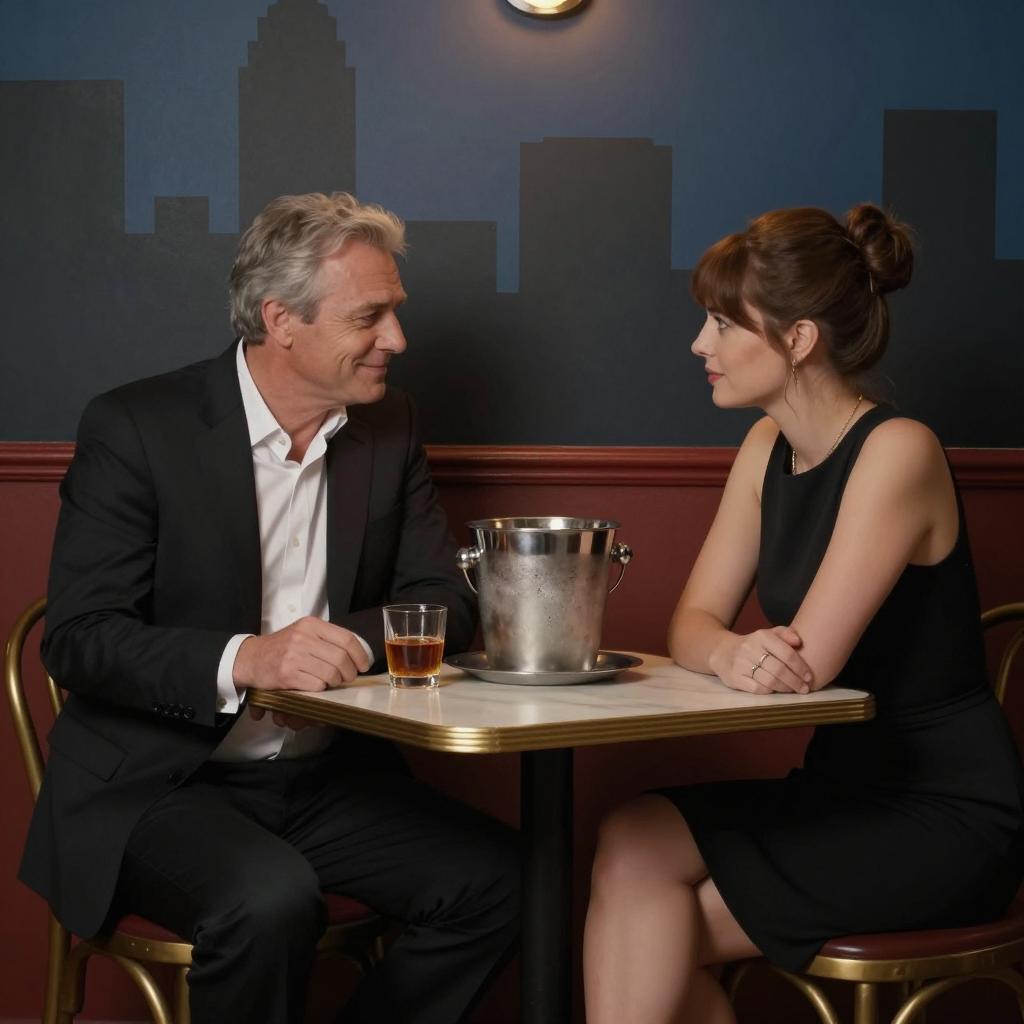 Man in dark suit and white shirt stands in yellow curtained shower stall, leaning against wall. Woman in red dress faces him, back turned. Patterned wallpaper surrounds the shower area. Man has short gray hair, serious expression. Woman's dark brown hair is in a bun. White towel hangs on wall to left.