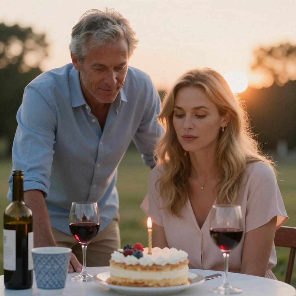Photograph of a man and woman at an outdoor sunset table. Man with short gray hair, light blue shirt, leaning over. Woman with blonde hair, pink top, looking down at cake. Cake with candle, two glasses of red wine, one blue patterned cup, brown bottle on table. Warm sunlight, blurred trees in background. Both have neutral expressions.