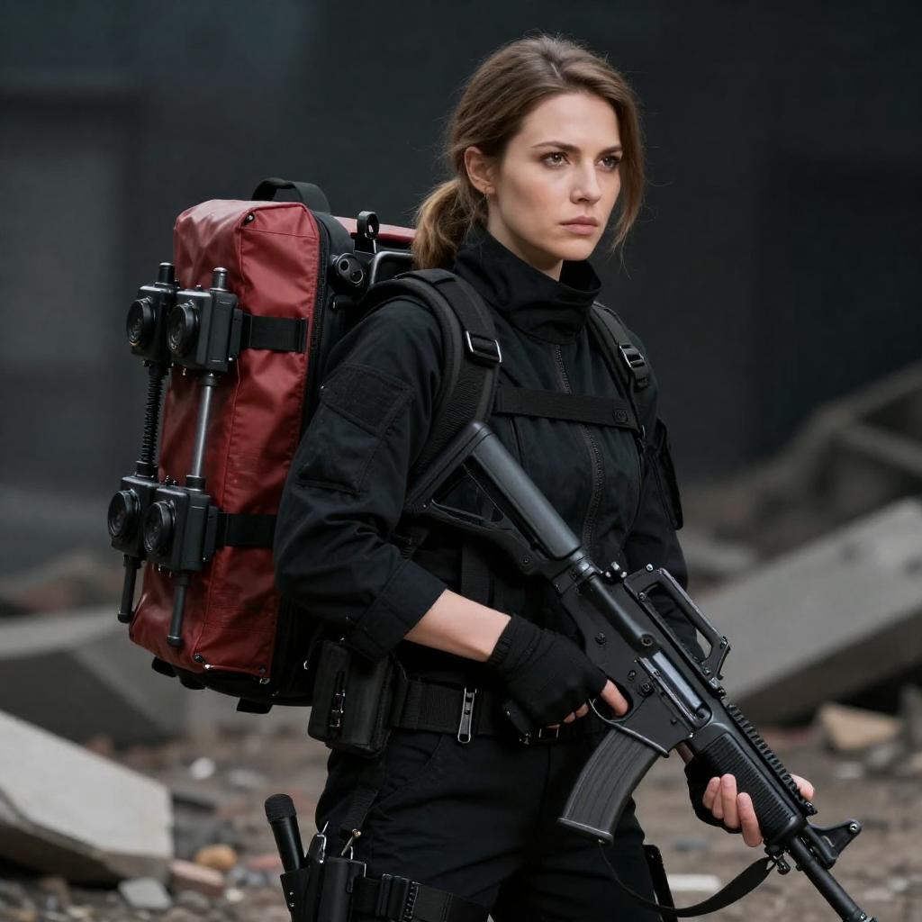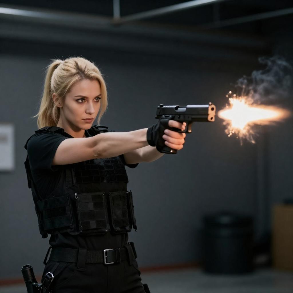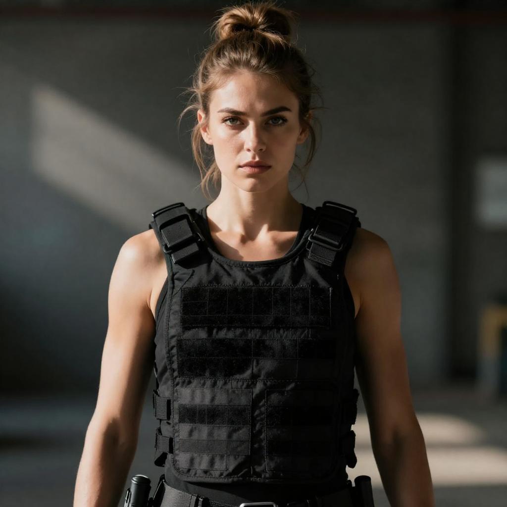 Photograph of a fit, Caucasian woman with light brown hair in a messy bun, wearing a black, sleeveless, tactical vest. She has a determined expression, standing in a dimly lit, industrial setting with blurred, angular shadows in the background. Sunlight highlights her muscular arms and chest.