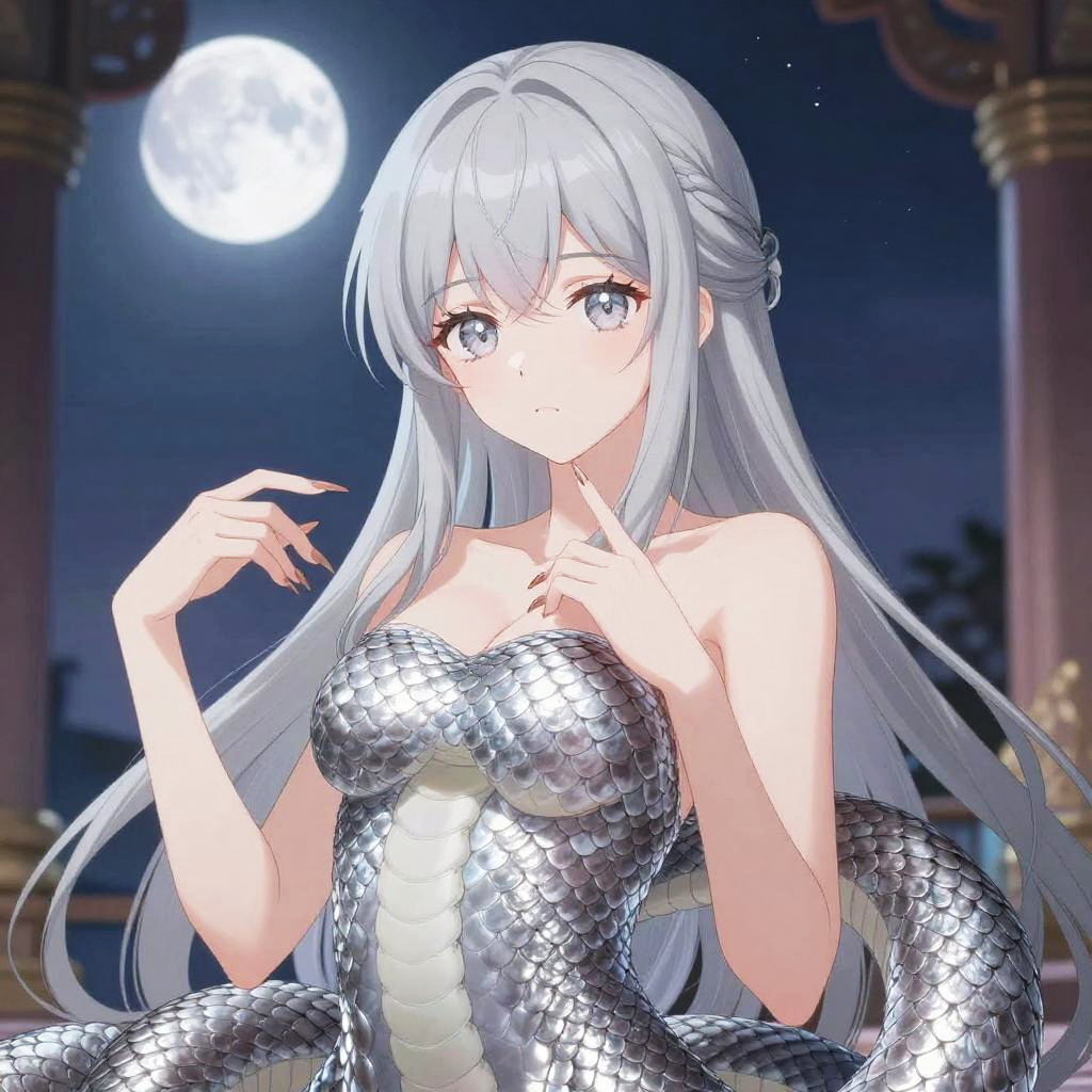 Elegant snake girl anime with silky silver scales covering parts of her body, delicate hands with claw-like nails, moonlit temple setting, soft pastel colors, ethereal and captivating aura