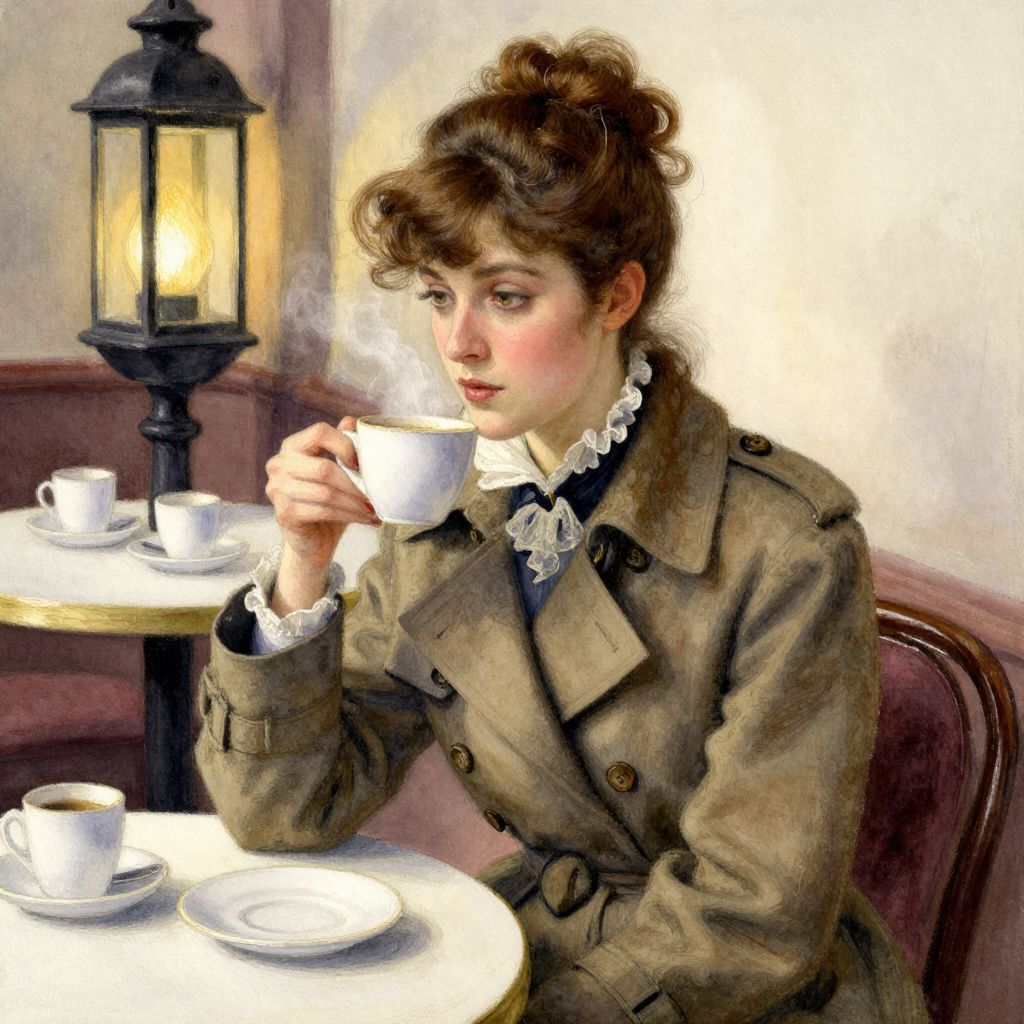 This digital painting in a realistic style depicts a young woman with fair skin and brown, wavy hair styled in an updo. She wears a brown, double-breasted coat with large buttons and a white lace choker. She is seated at a small, round, white table with a black, ornate lantern emitting a warm light in the background. The woman holds a white cup of steaming coffee in her right hand, while another cup and saucer are on the table in front of her. The wall behind her is a soft cream color, and she sits on a dark red upholstered chair.