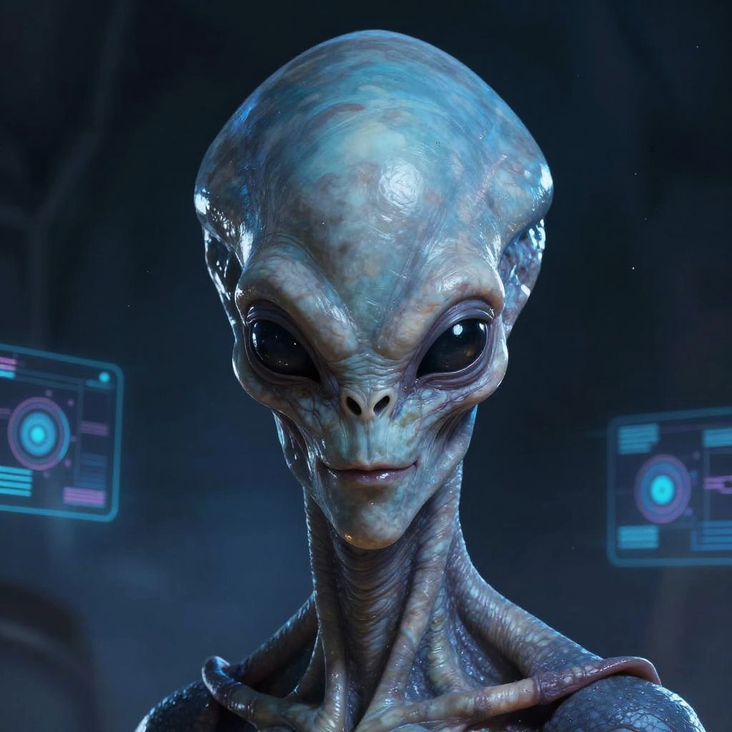 Close-up portrait of a conehead alien with smooth, elongated cone-shaped skull, pale blue skin, glowing eyes, mysterious expression, sci-fi background with floating holograms and stars, highly detailed, digital painting style.