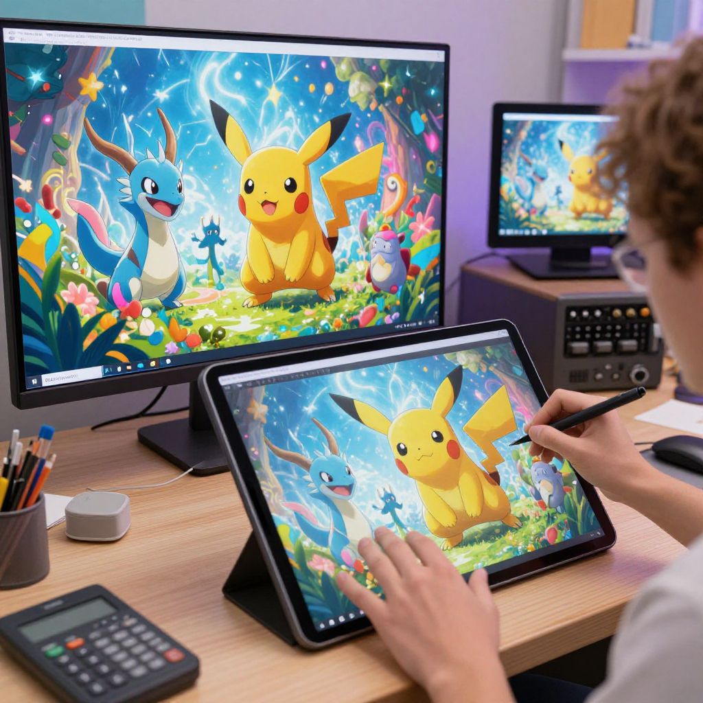 Photograph of a person with curly brown hair, seen from the back, drawing on a tablet displaying a brightly colored digital illustration of Pikachu, a yellow, mouse-like Pokémon, alongside a blue, aquatic Pokémon, and a small, white Pokémon. The digital artwork features a vibrant forest with multicolored flowers and glowing stars. Two large computer monitors showing the same image sit on a wooden desk. The desk also holds a pencil holder with pencils, a calculator, and an external hard drive. The background has a window letting in soft daylight. The overall scene is colorful and lively.