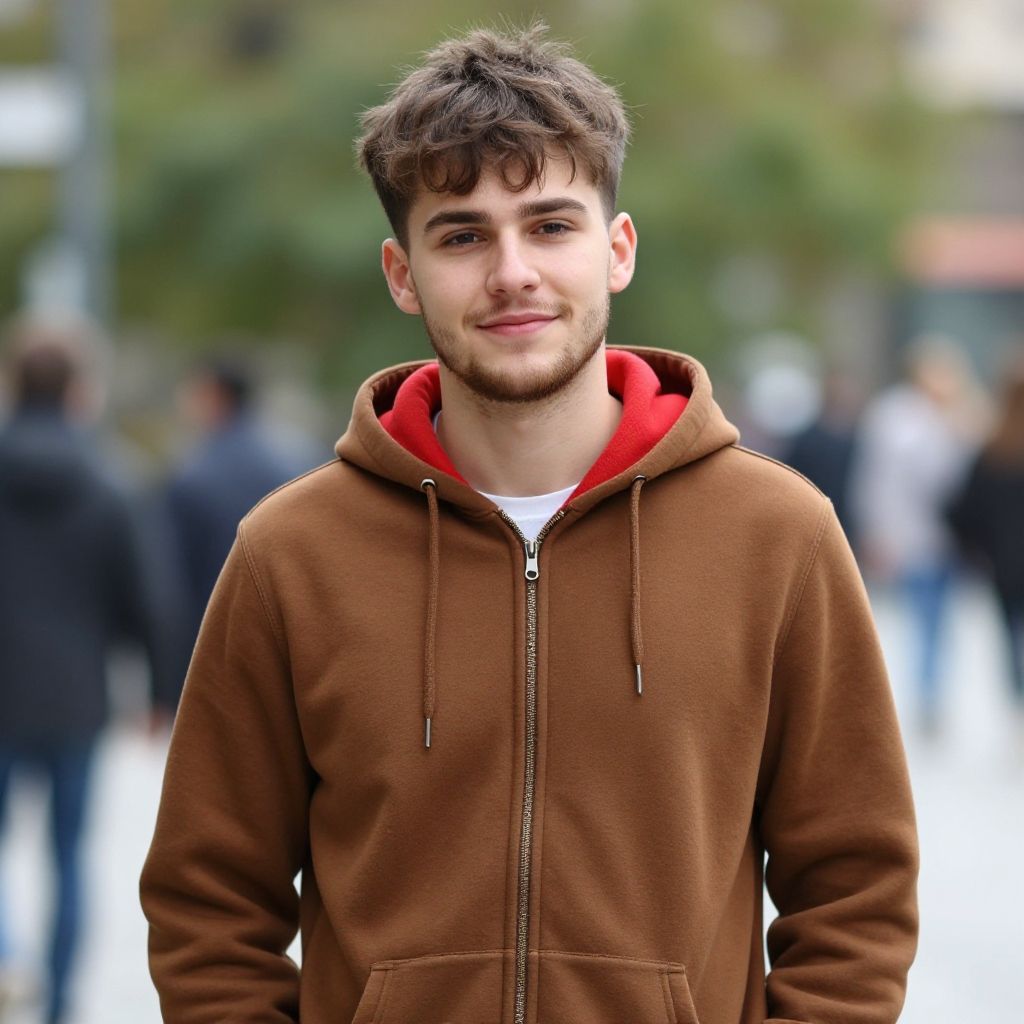 A young man wearing a brown zip-up hoodie with a red hood lining stands outdoors in a casual urban setting. He has short, tousled hair and a light beard, smiling softly with a relaxed and confident demeanor amidst a blurred background of people and greenery.