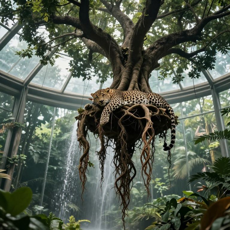 The last leopard sleeps eternally beneath a forest suspended upside-down from a glass ceiling, roots dangling in the air like hanging gardens.
