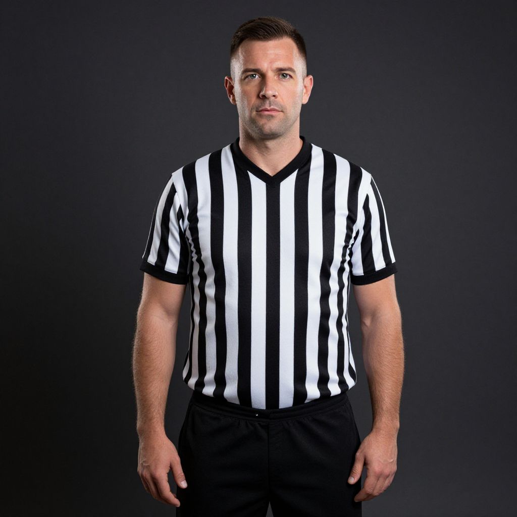A man dressed in a classic black and white striped referee costume stands confidently against a dark background. This photorealistic, detailed studio portrait captures the professional and focused demeanor of the individual in sports officiating attire.