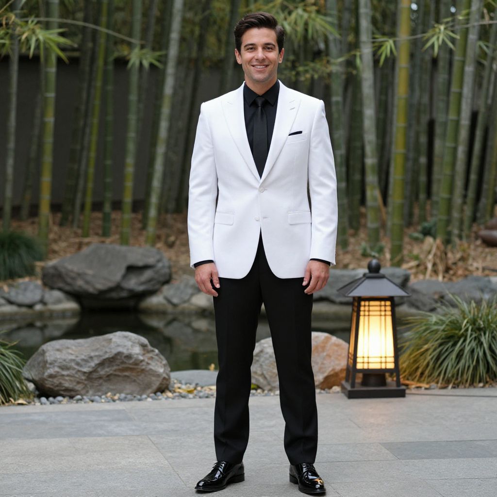 A photograph of a smiling man standing outdoors. He has short, dark brown hair and is wearing a sharp white suit jacket, black dress shirt, black tie, and black dress pants. His black shoes are polished. In the background, there's a bamboo forest, a small pond with rocks, and a lit lantern on the ground. The setting has a calm, elegant vibe.