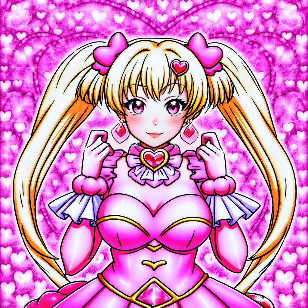 Digital illustration of an anime-style magical girl character with long blonde twintails adorned with heart-shaped hair ornaments. She has pink eyes, wears a pink strapless dress with gold accents, a pink choker with a heart pendant, matching pink wrist cuffs, and heart-shaped earrings. The background is filled with pink glowing hearts, enhancing the magical and vibrant theme of the artwork.