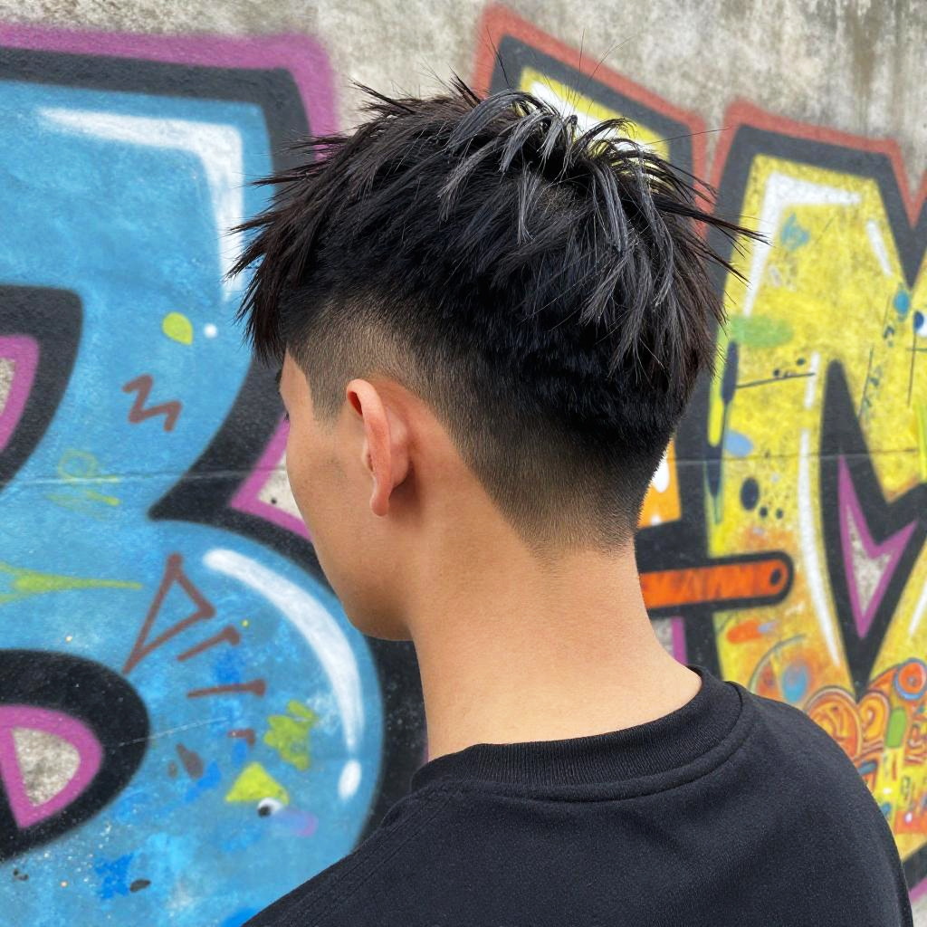 Back of a two block haircut with faded sides, trendy streetwear look, graffiti wall behind, vibrant colors and dynamic composition, ultra-detailed hair strands
