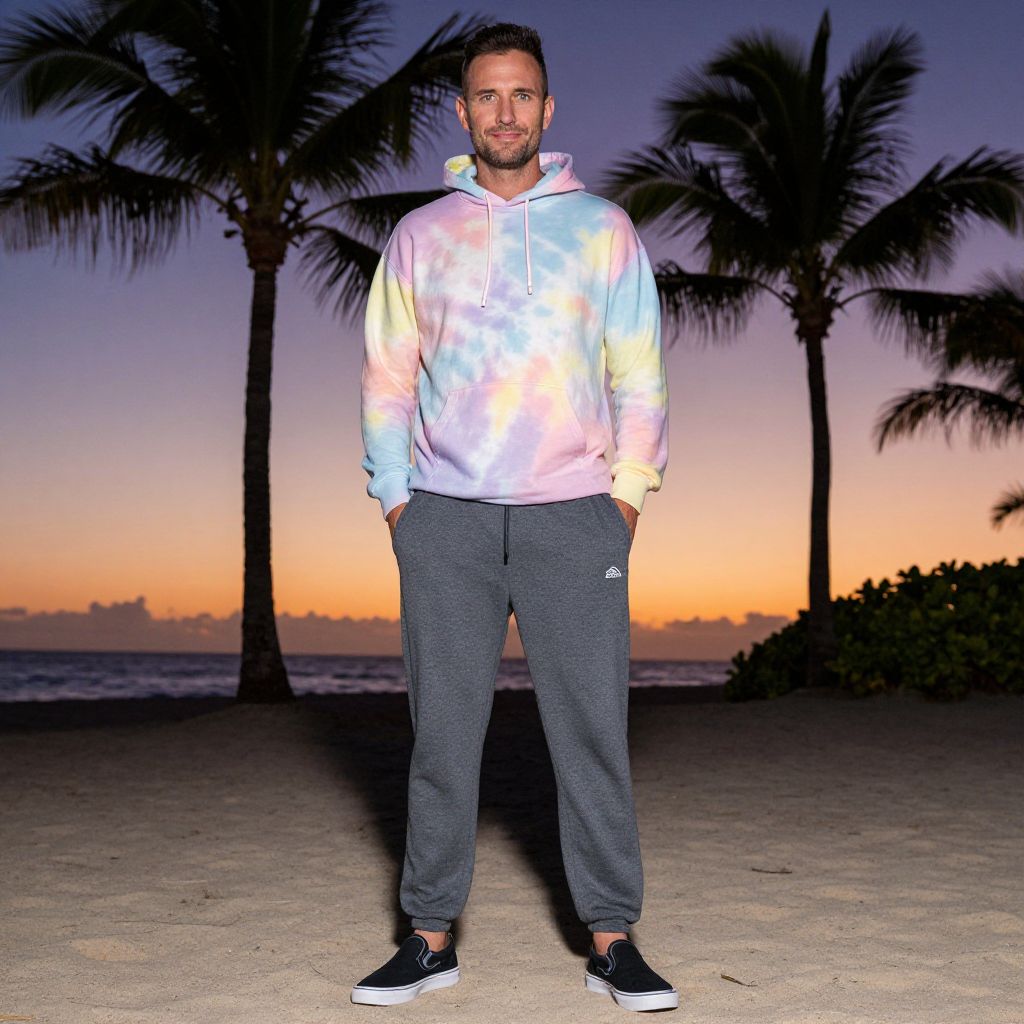 A man, casual look, pastel tie-dye hoodie, grey fleece track pants, slip-on black trainers, tropical beach oasis, swaying palm trees, vibrant sunset hues, camera obscura style, relaxed pose, smiling softly, hands in pockets.Man has masculine face and piercing eyes