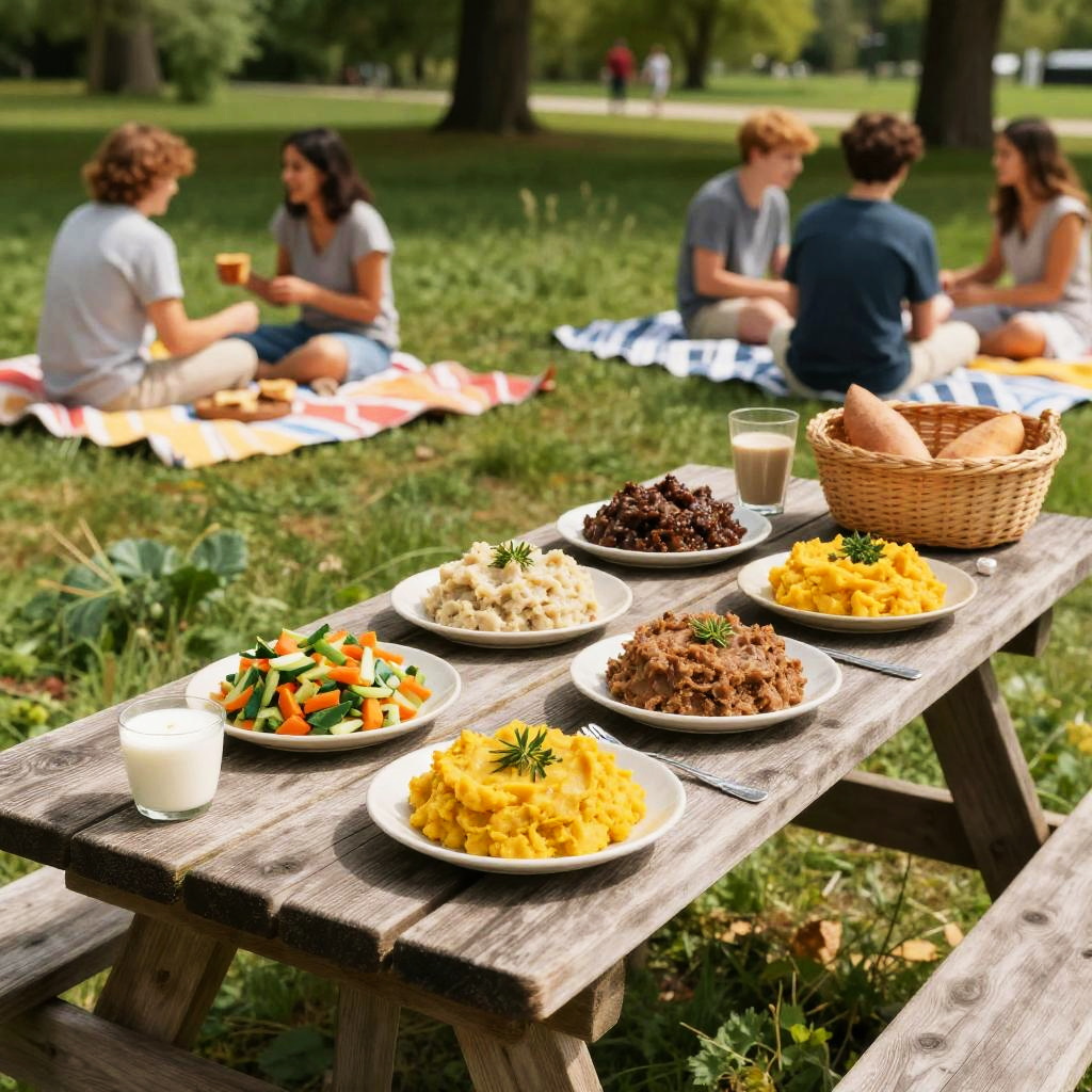 Brei in a vibrant outdoor picnic scene, a rustic wooden picnic table laden with different kinds of brei including vegetable mash and sweet potato brei, surrounded by people enjoying a sunny, lively day in a lush park, colorful blankets and baskets.