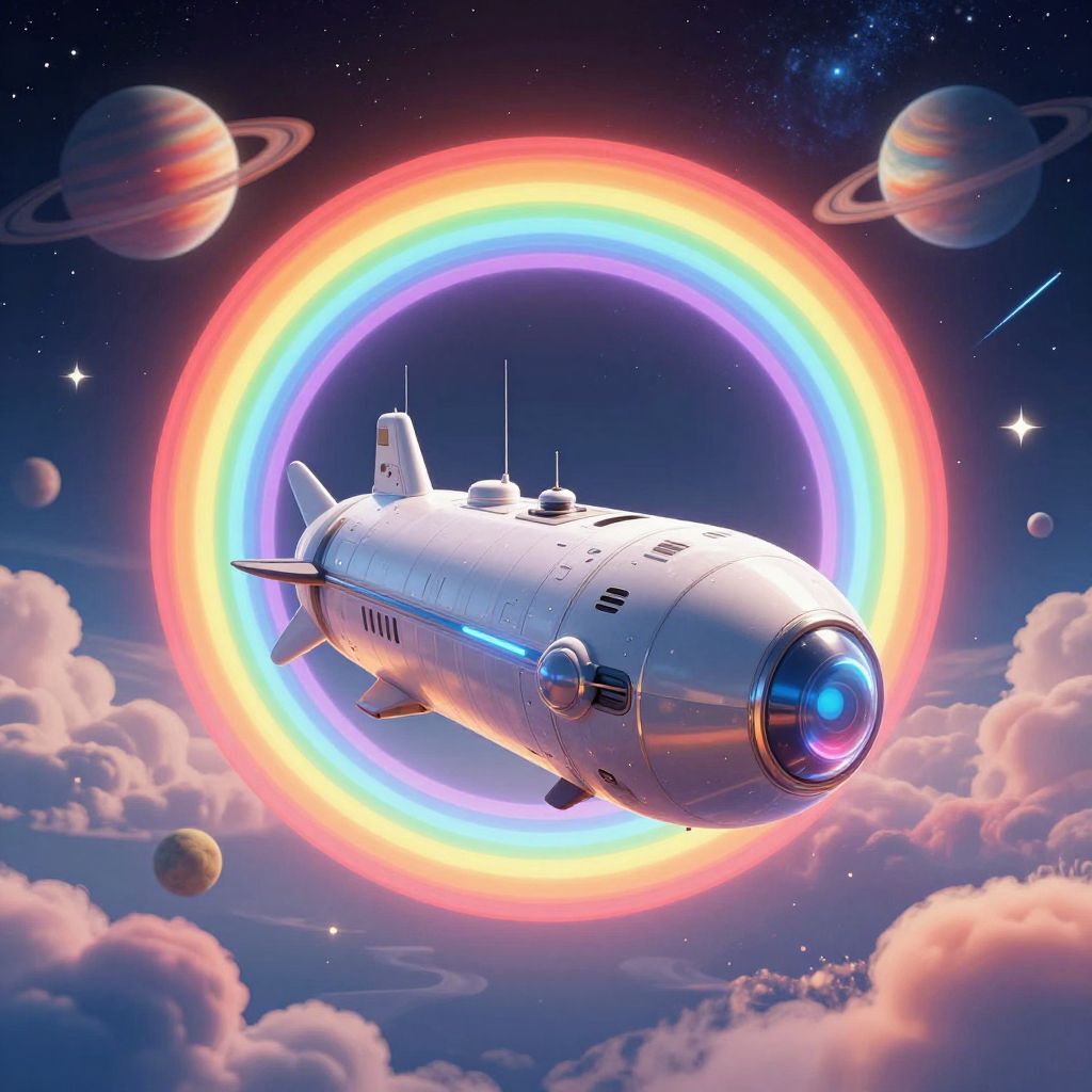 Digital artwork of a sleek, futuristic space submarine floating amidst colorful clouds and a radiant, concentric rainbow halo. The backdrop features vibrant planets with rings, shooting stars, and cosmic elements, creating a vivid outer space scene.