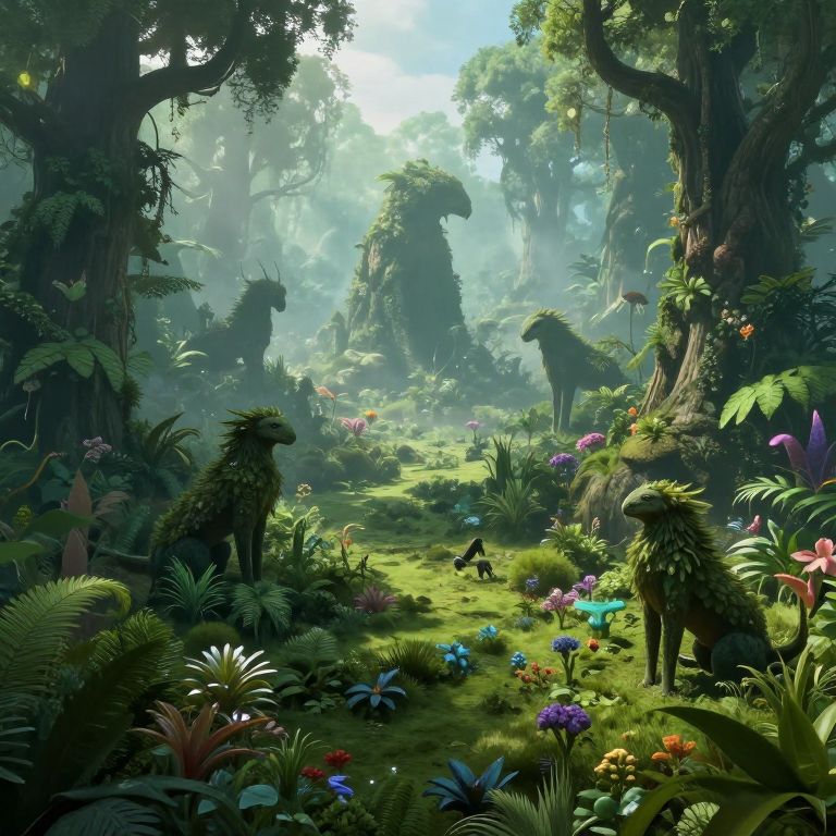 A captivating fantasy landscape from an eye-level viewpoint beckons viewers into a magical world where nature and mysticism merge effortlessly. Enigmatic beings arise from verdant foliage, their silhouettes merging seamlessly with the forest's rich vegetation as if they were sculpted by it. A delicate haze drifts through the air, surrounding both mythical beasts and enchanted plants in an aura of wonder and tranquility. This captivating depiction not only carries audiences into a realm of dreams but also encourages them to delve into their own imagination and artistic prowess.