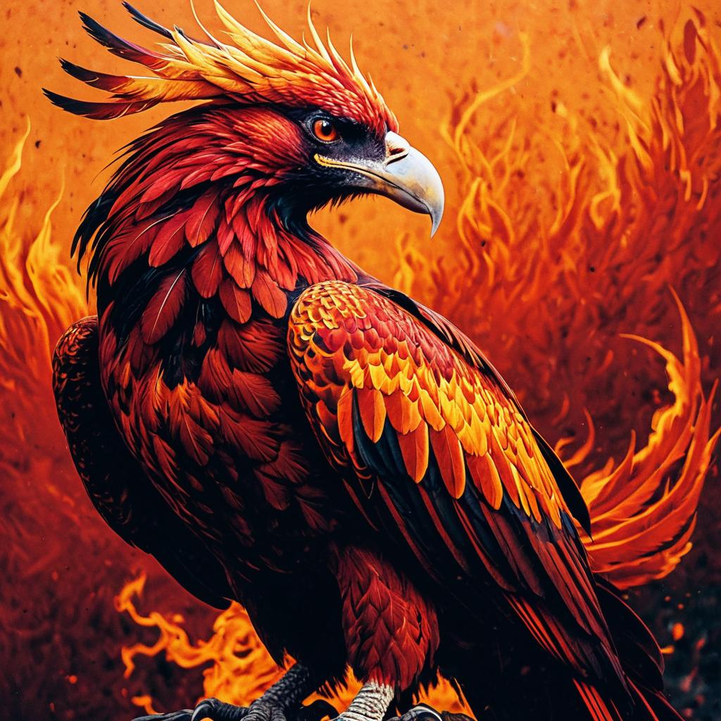 A hyper-realistic oil painting portrait of a phoenix with vibrant fiery orange and black feathers, surrounded by glowing embers and flames. The artwork features warm amber highlights, intricate feather details, and a dramatic, mystical atmosphere with hints of pastel and misty effects, portraying a powerful and seductive mythical bird.
