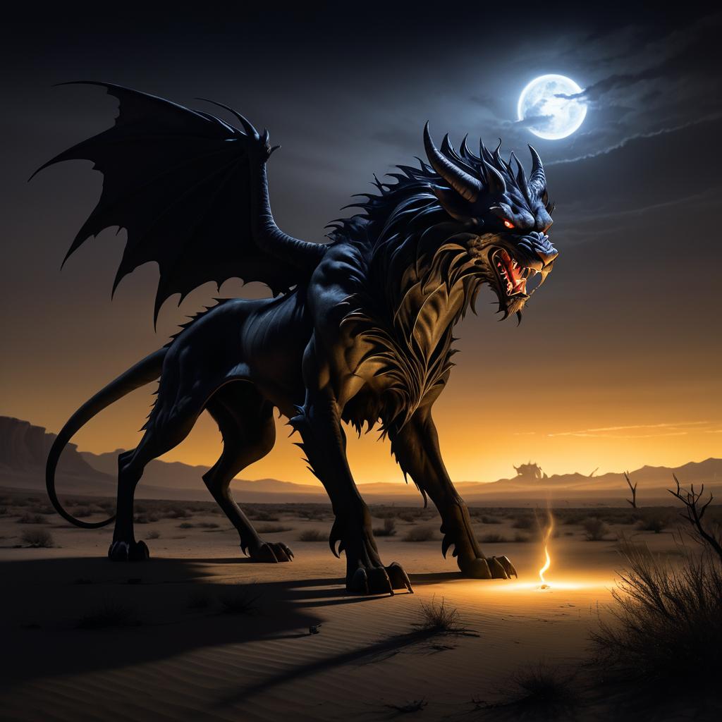 Airbrush drawing of a desolate wasteland, featuring a hybrid Chimera-Vampire with shadowy tendrils, hyper-realistic with torchlight.