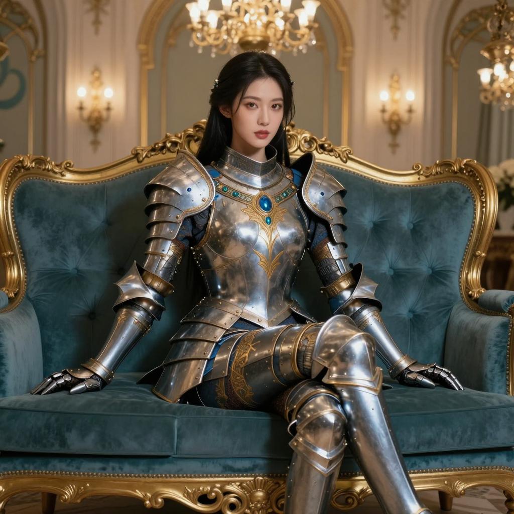 A female warrior wearing highly detailed ornate blue and gold fantasy armor with intricate metallic texture and gemstone embellishments, sitting confidently on an elegant vintage sofa with luxurious deep teal upholstery and golden carved wooden frame, illuminated by warm chandelier light in a grand lavish room, art nouveau style elements, strong contrast and refined mood