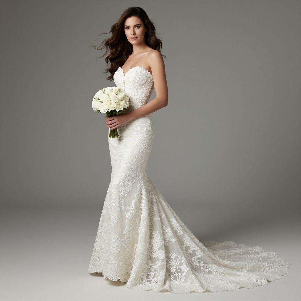 Photograph of a beautiful woman with long, wavy dark brown hair standing against a plain gray background. She is wearing a strapless, form-fitting white lace wedding dress with a sweetheart neckline and a long, flowing train. She holds a bouquet of white roses in both hands. Her skin is light, and she has a confident, serene expression. The lace on her dress features intricate floral patterns, and the texture appears delicate and elegant. The lighting is soft, highlighting the details of the lace and her elegant figure.